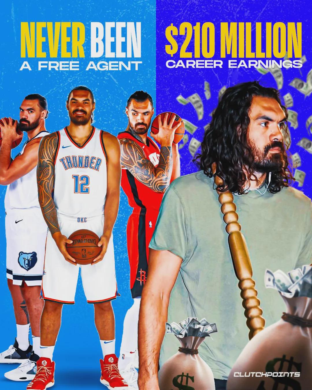 大家应该可以理解,亚当斯和火箭续约之后,为何要感谢那么多人。算上和火箭的这份新合同,亚当斯生涯总薪水来到2.1亿美元。亚当斯的四次续约分别来自雷霆、鹈鹕、灰熊和火箭,他从来没有当过自由球员,全都是提前续约。