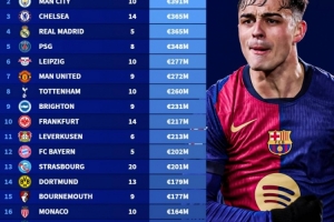 五大联赛队内U23球员身价榜:巴萨6.15亿欧高居榜首,曼城次席